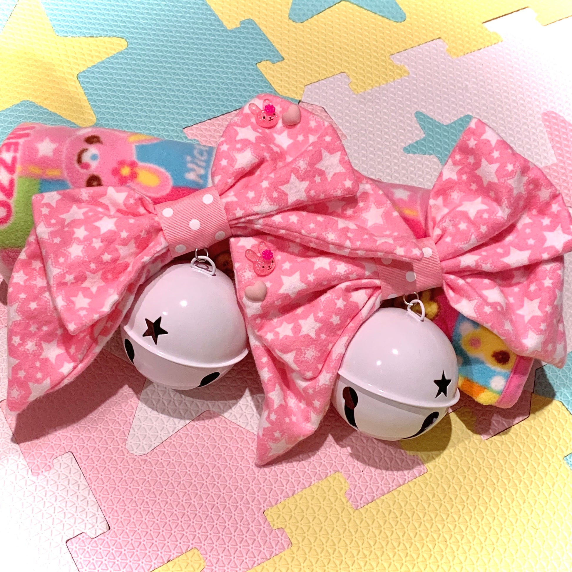 two handmade bow clips with giant 4” bells attached! These are somewhat heavy, so they need to be worn above a ponytail for best stability. The bells are also a little bit loud!