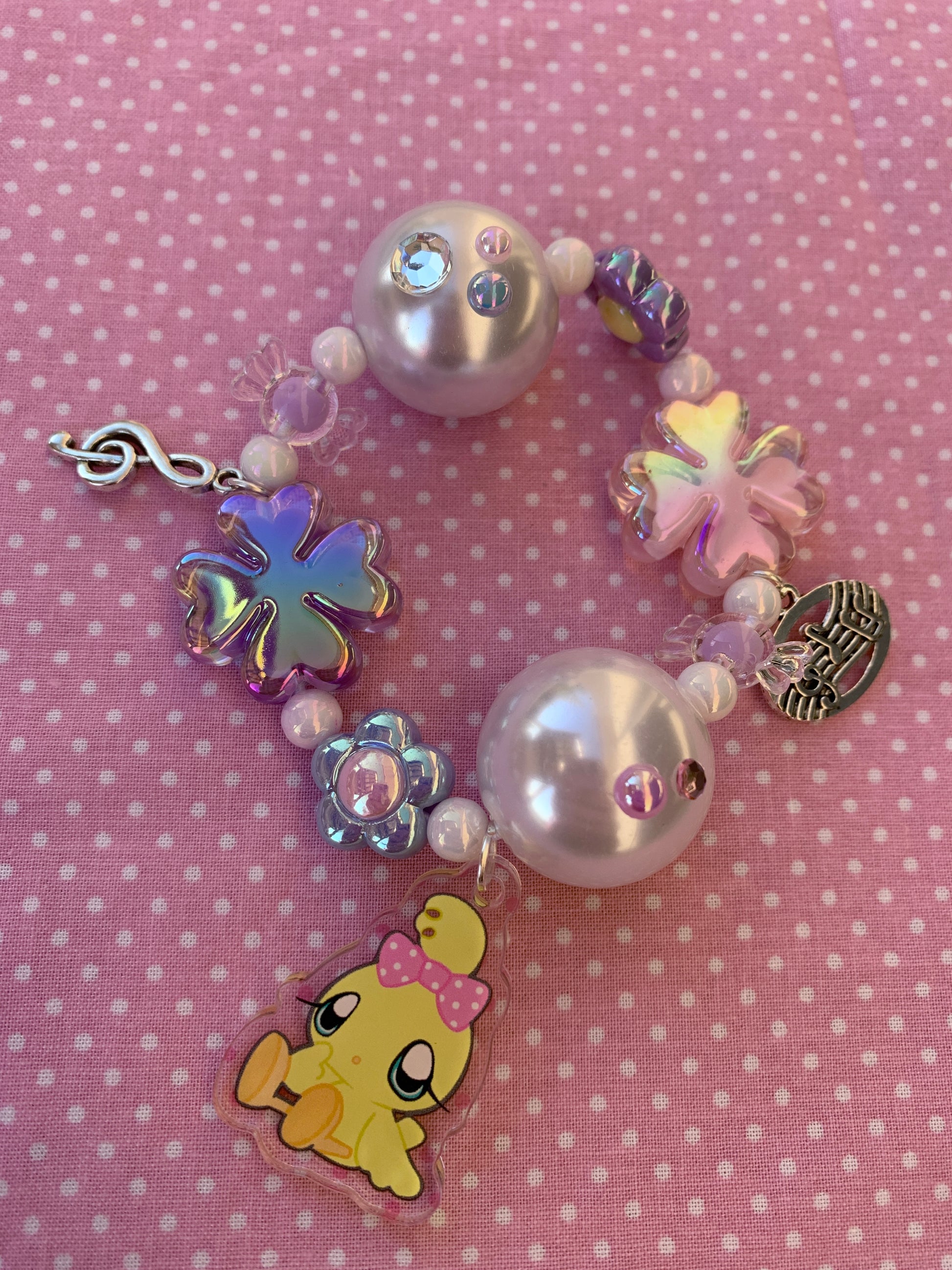 A fun bracelet featuring big pearls, music motifs, clovers, and Pipipi!