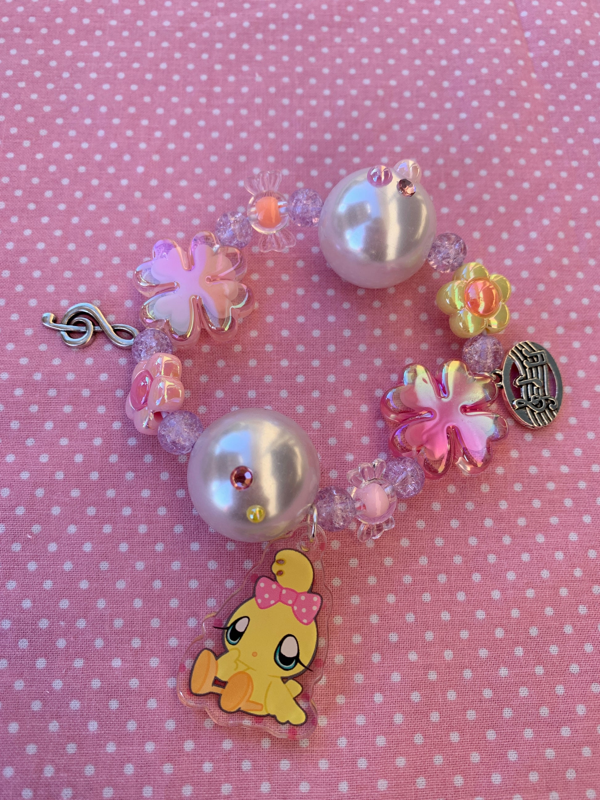 A fun bracelet featuring big pearls, music motifs, clovers, and Pipipi!