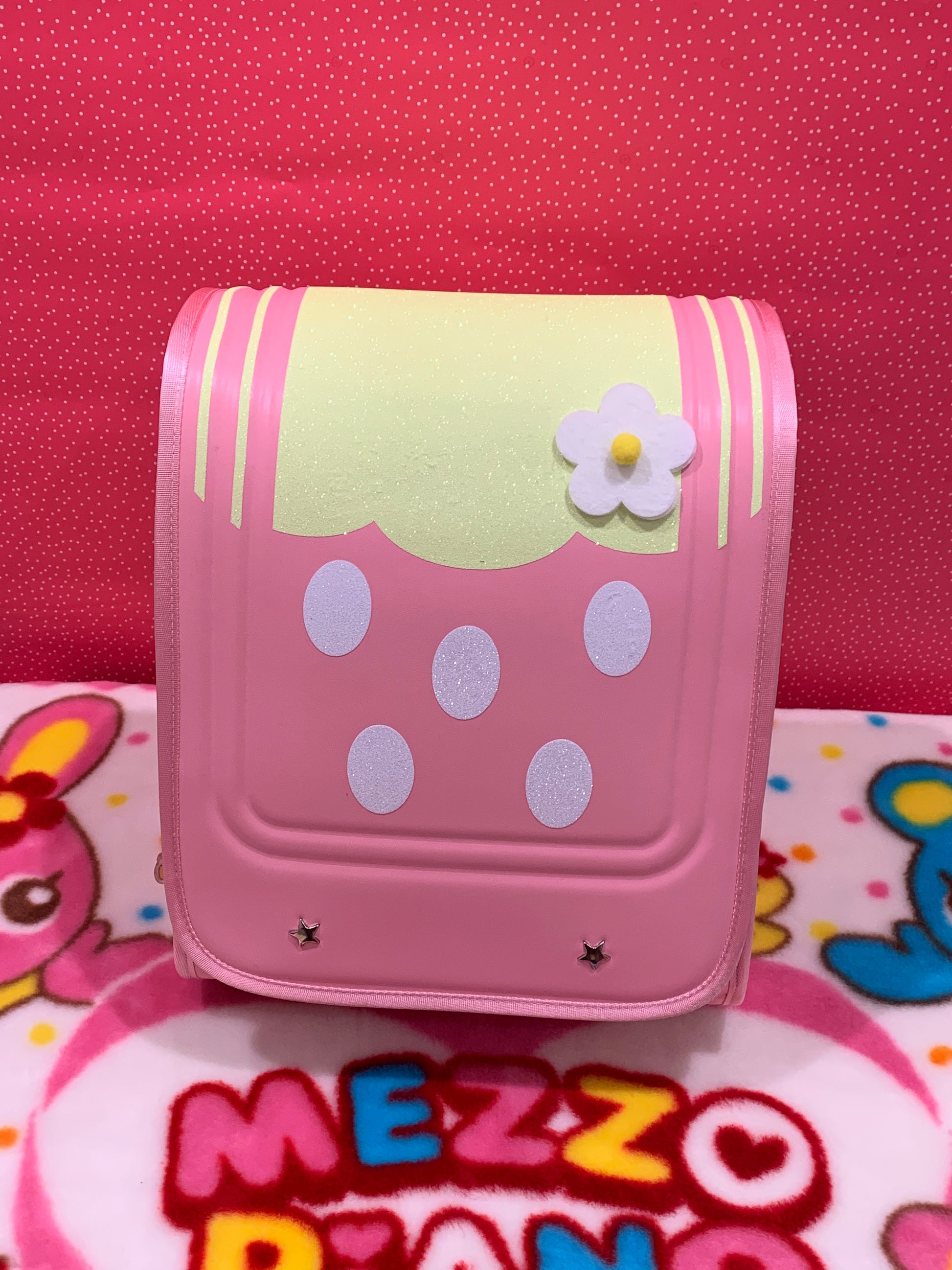 Large capacity randoseru with a strawberry motif! Magnetic Flower. Comes with a keychain handmade by @bugsprinkles! All randoseru come with a Pipipi keychain as well, and a heart shaped carabiner.
