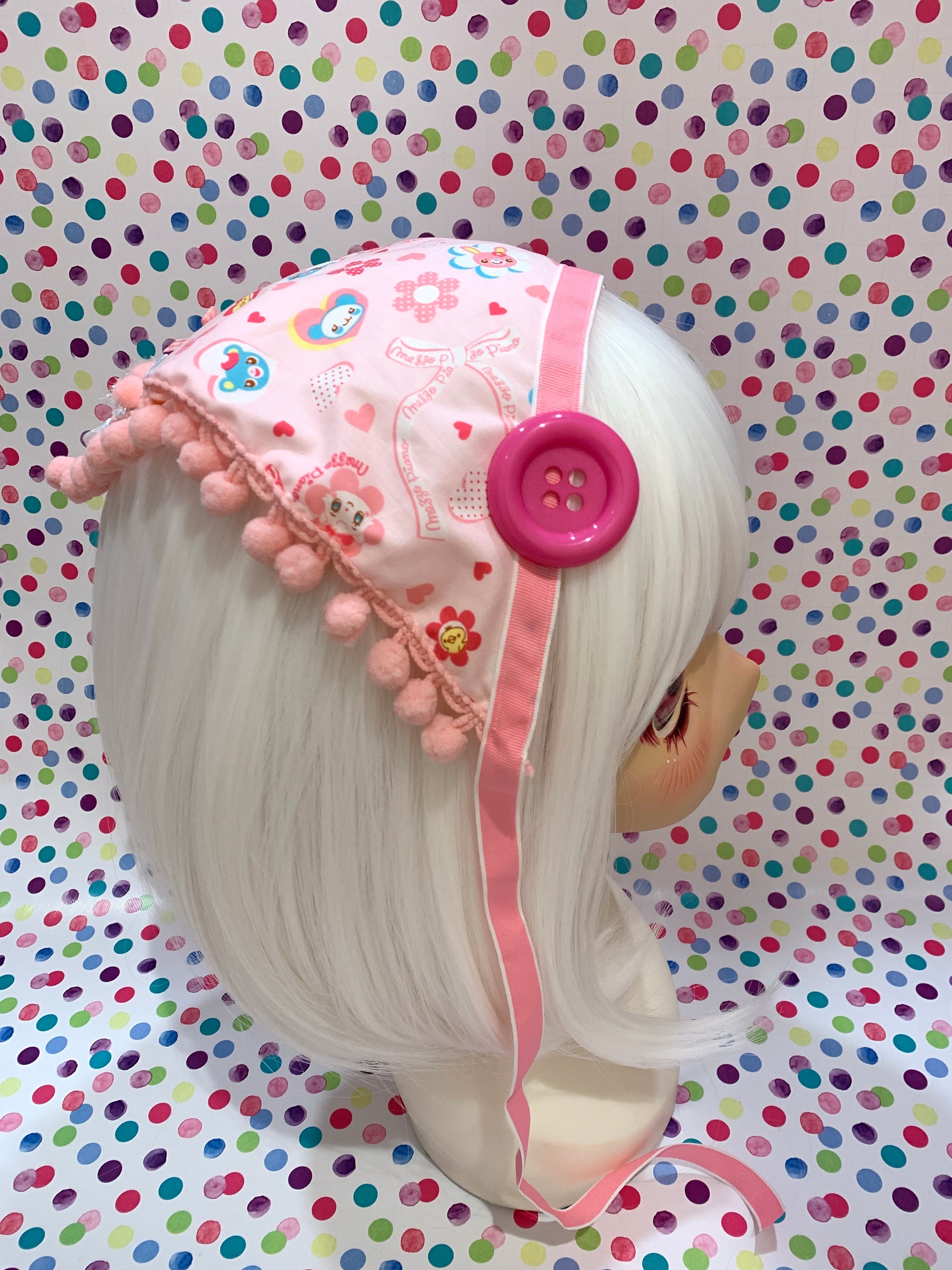 sweet pink bandana made from official mezzo piano fabric! Features pompom trim and giant dark pink buttons.