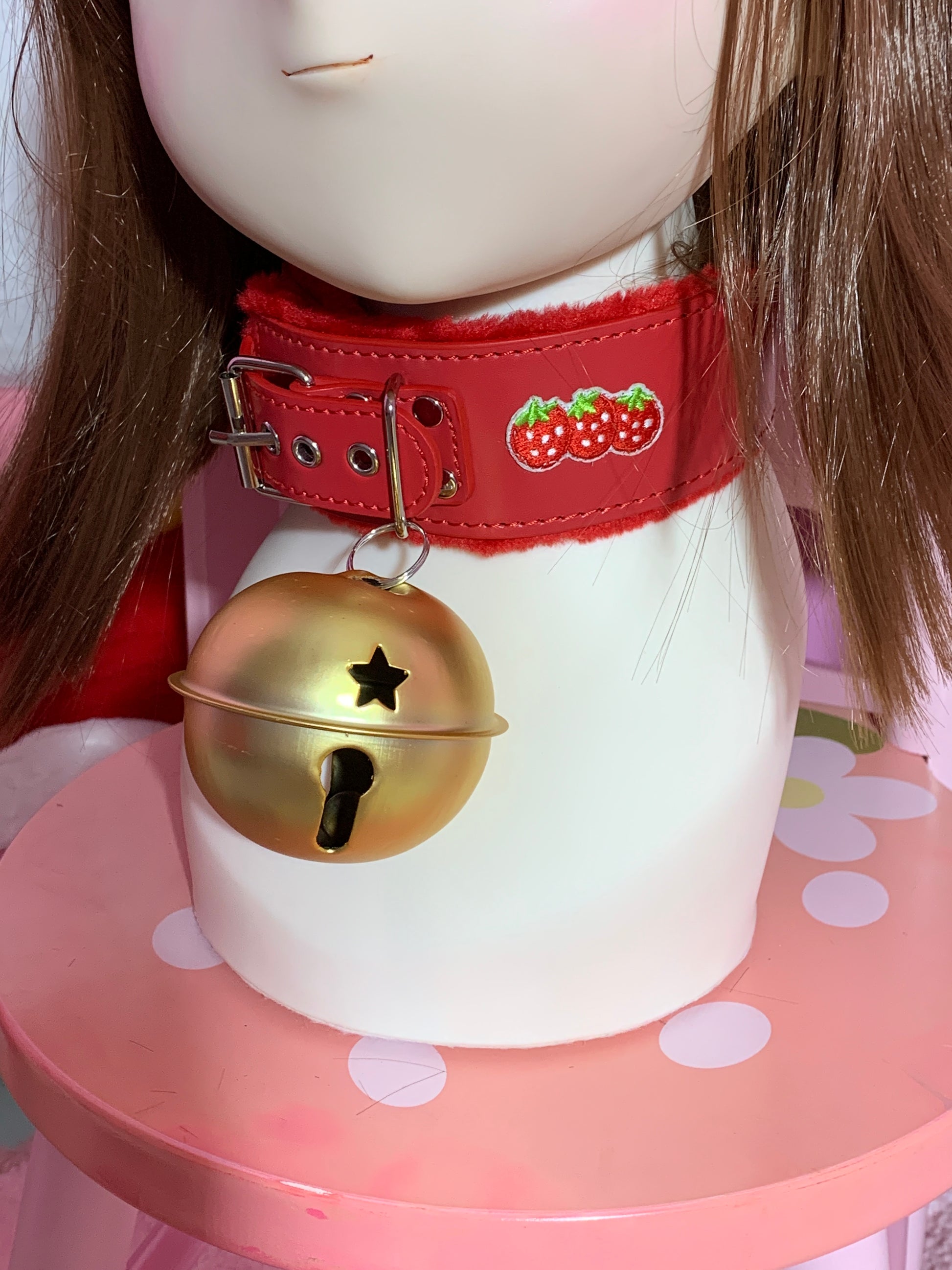 A red fuzzy collar with a giant gold bell and strawberry patch!
