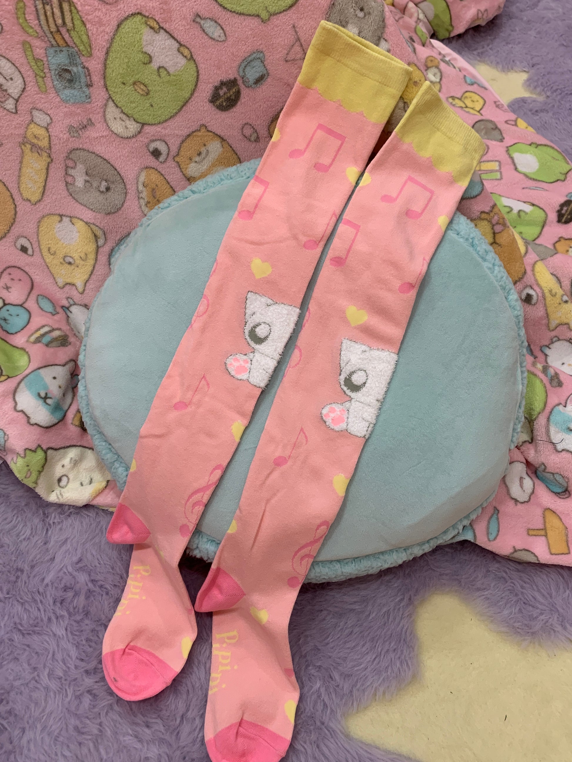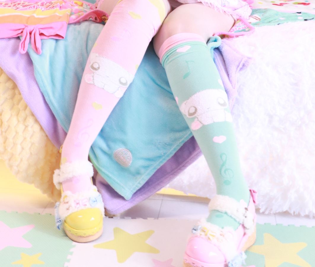 Pipipi Symphony’s first manufactured product! It will mean the world to me if you purchase these, if they do well we’ll continue to have more items like this in the future! <333 These socks are jacquard knit and feature music notes all over, a scalloped design at the top, and a soft and fuzzy little creature in the middle! Is it a dog? Is it a cat? No, it’s just a creature :3