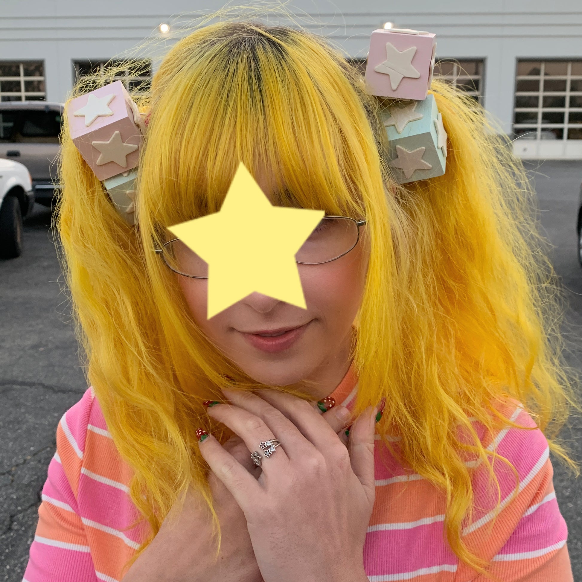 Painted 1.5” wooden blocks with painted wooden stars attached! Because of the nature of the materials, please be aware that these are somewhat heavy. I recommend putting on regular hair ties first, and then adding these on top. It makes them more stable! ^o^💗