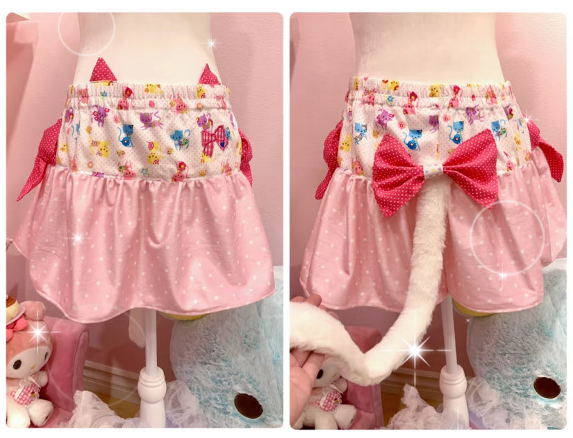 Cute cat themed skirt with ears and a fluffy detachable tail, and 3D puffy bows! Approximate size M. Max hips 40โ