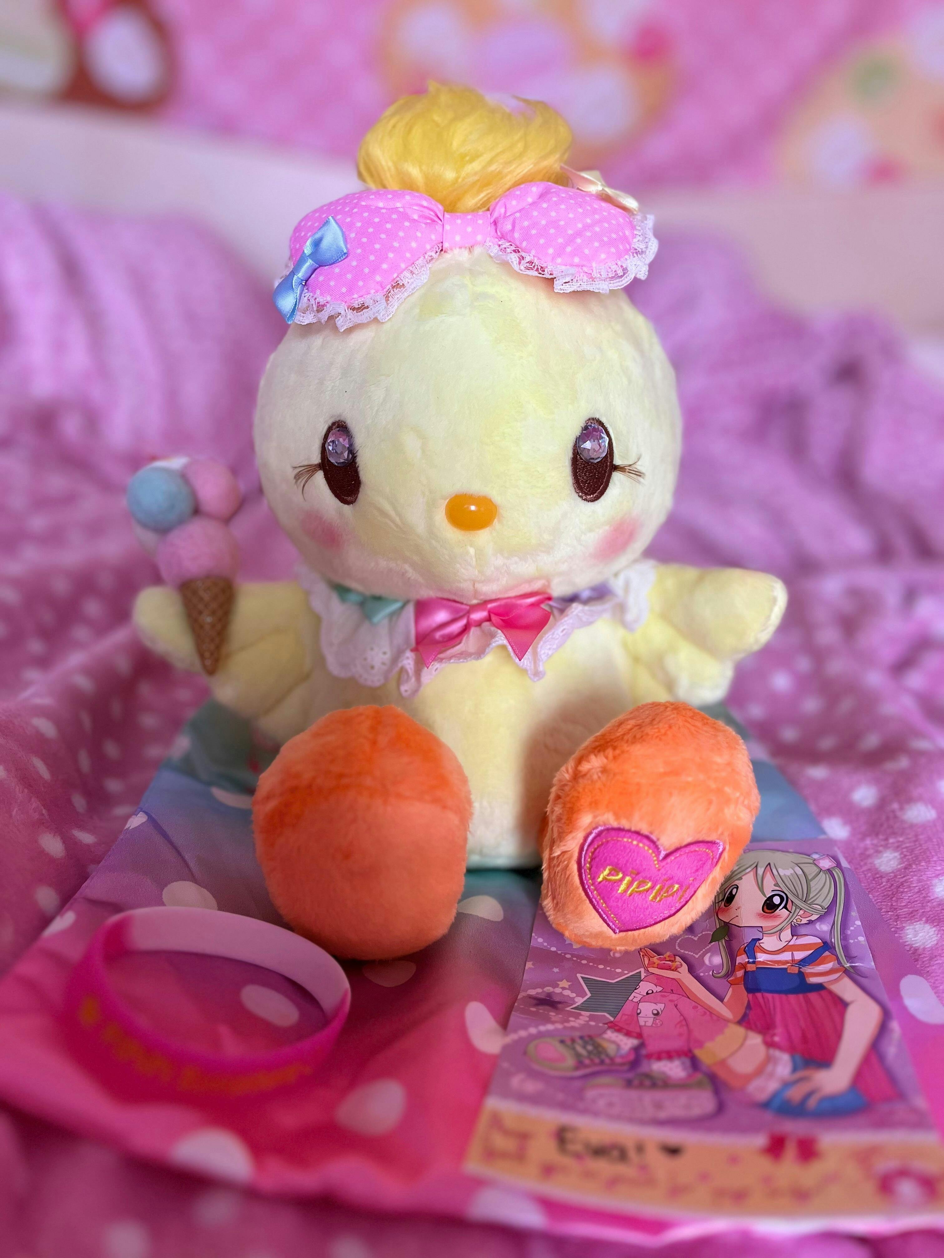 Every Pipipi plush has her own sparkly rhinestone eyes, lovely long lashes, blushed cheeks, and a delicious ice cream cone with a cherry and sprinkles on top! Do you like her lacey collar decked out with colorful ribbons? 🥺🥺🩷🩷🩷🐣
