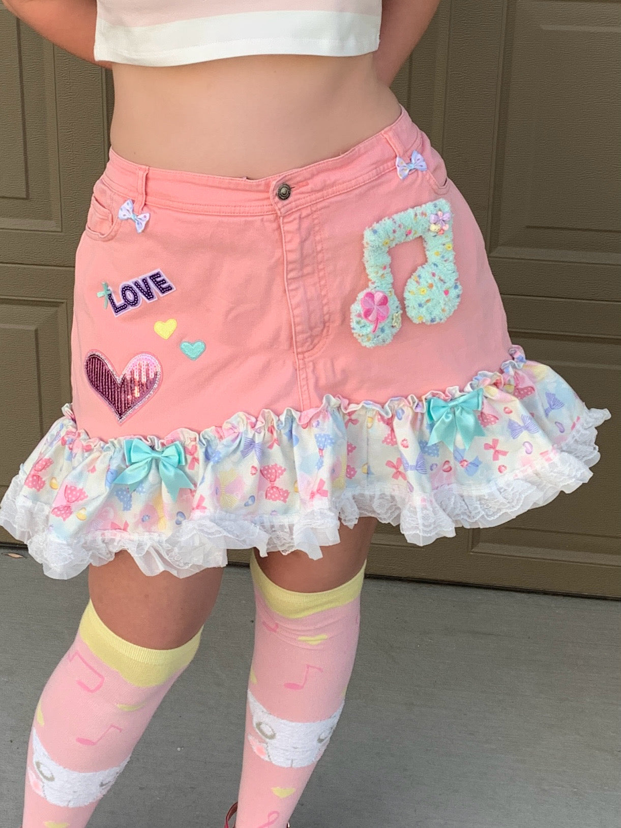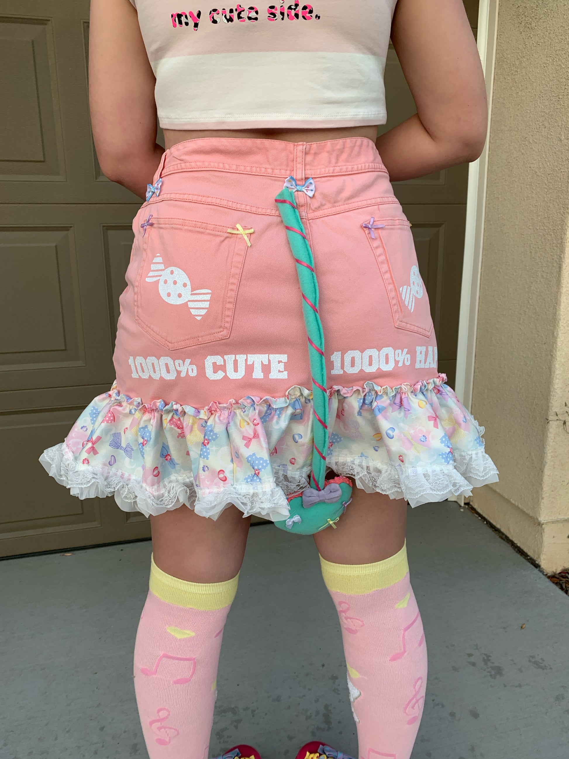 Size 18/XXL/plus size pink denim skirt with detachable, bendable devil tail and music note brooch! Adorned with lots of ribbons and patches and glittery print<3 the print reads ‘1000% CUTE 1000% HAPPY’ ^w^