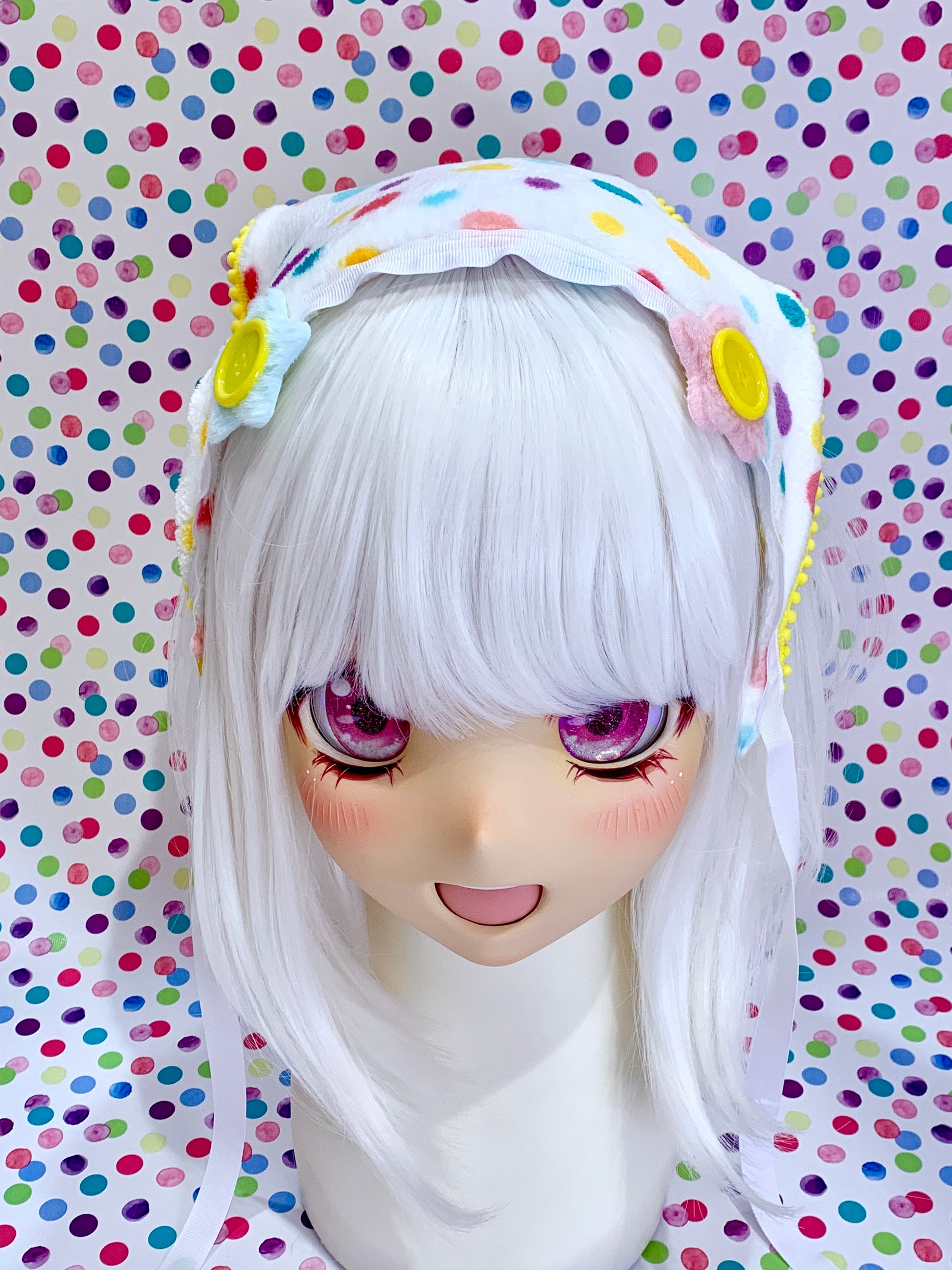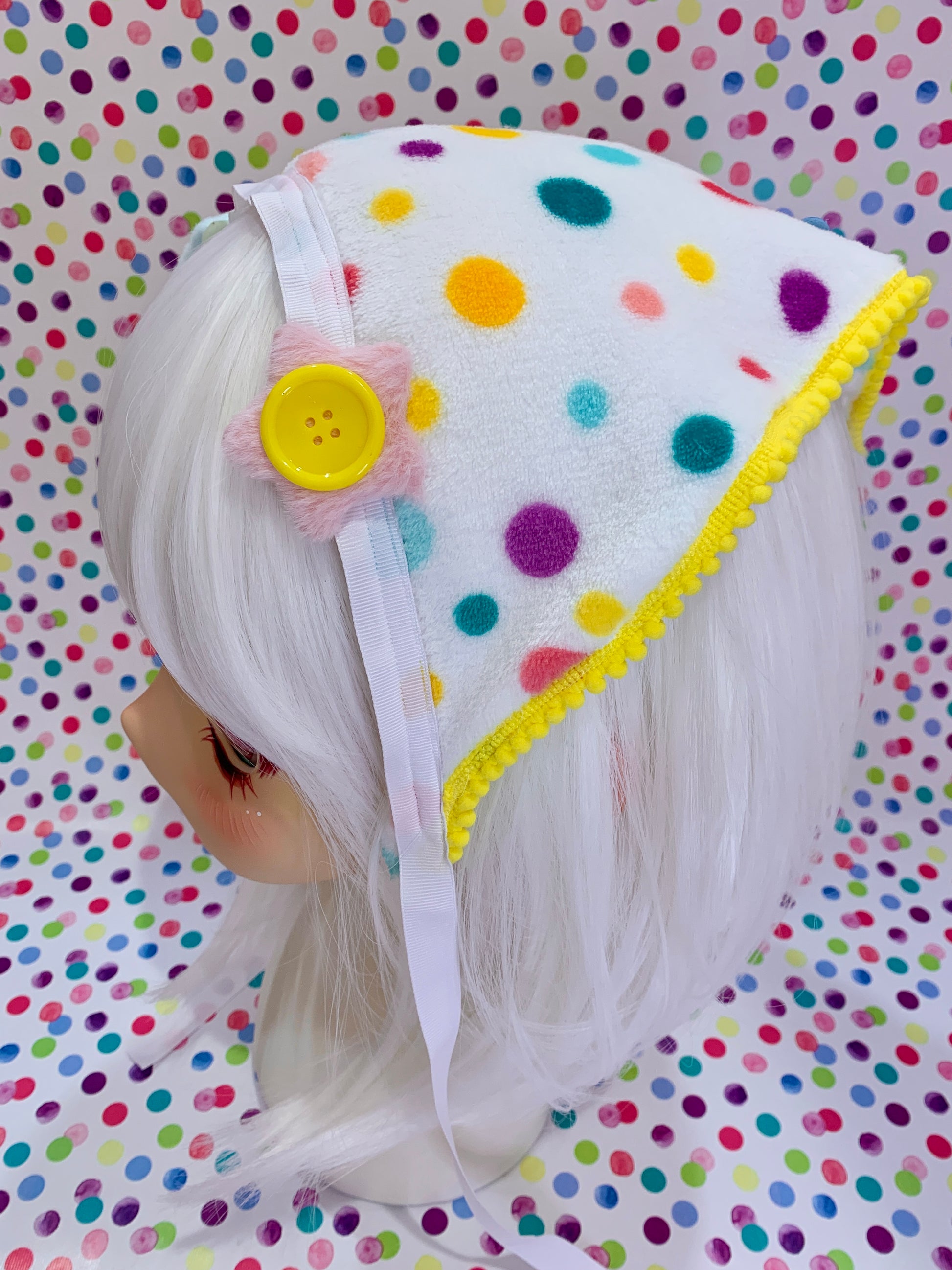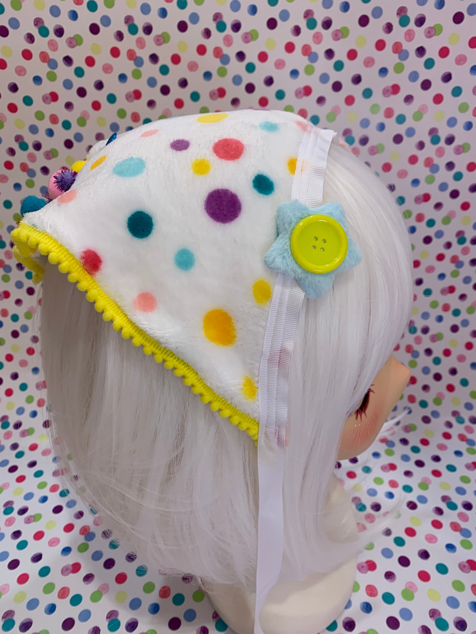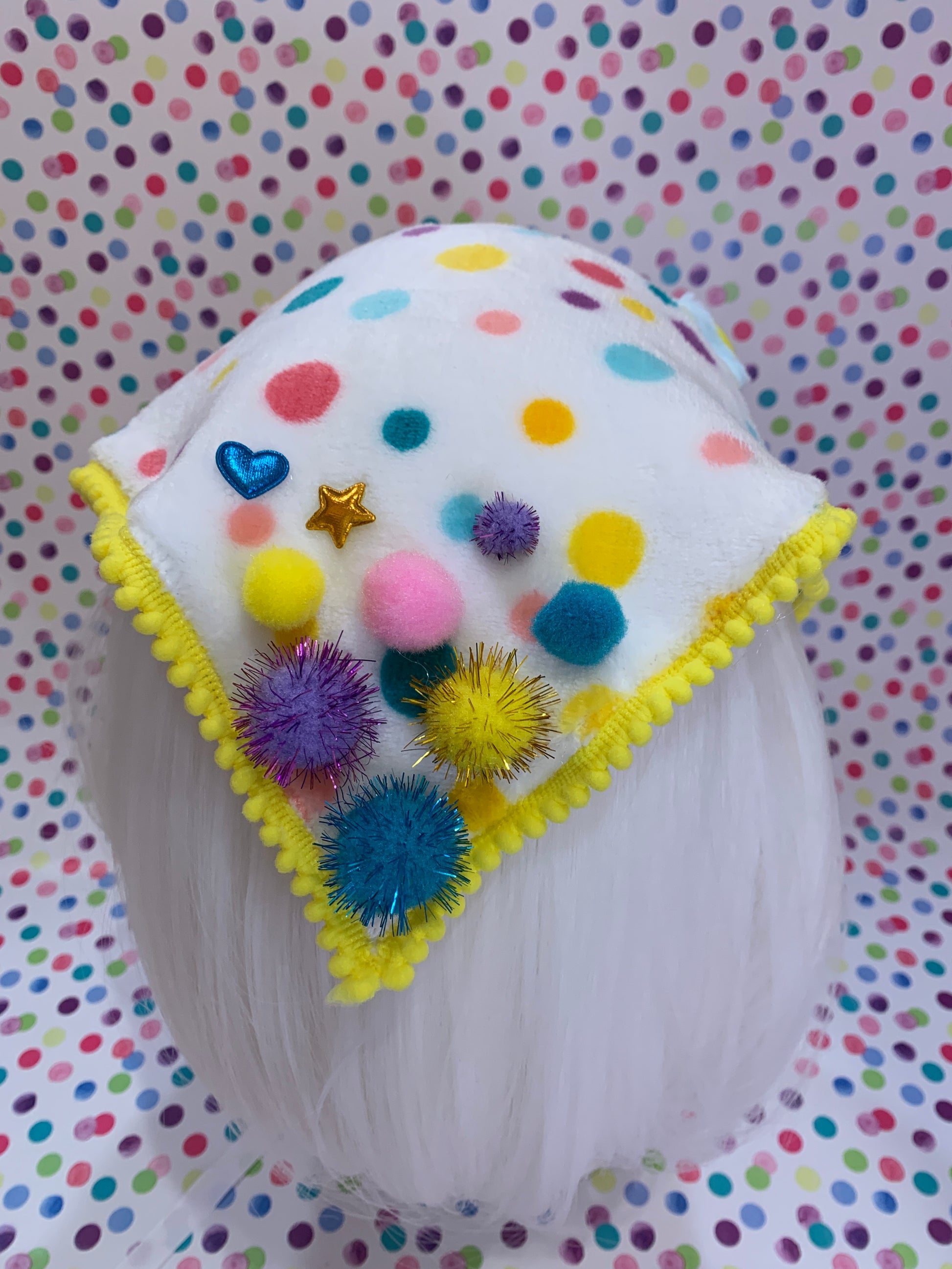 a polka dot handmade bandana made from a soft material. Features colorful tinsel pompoms!