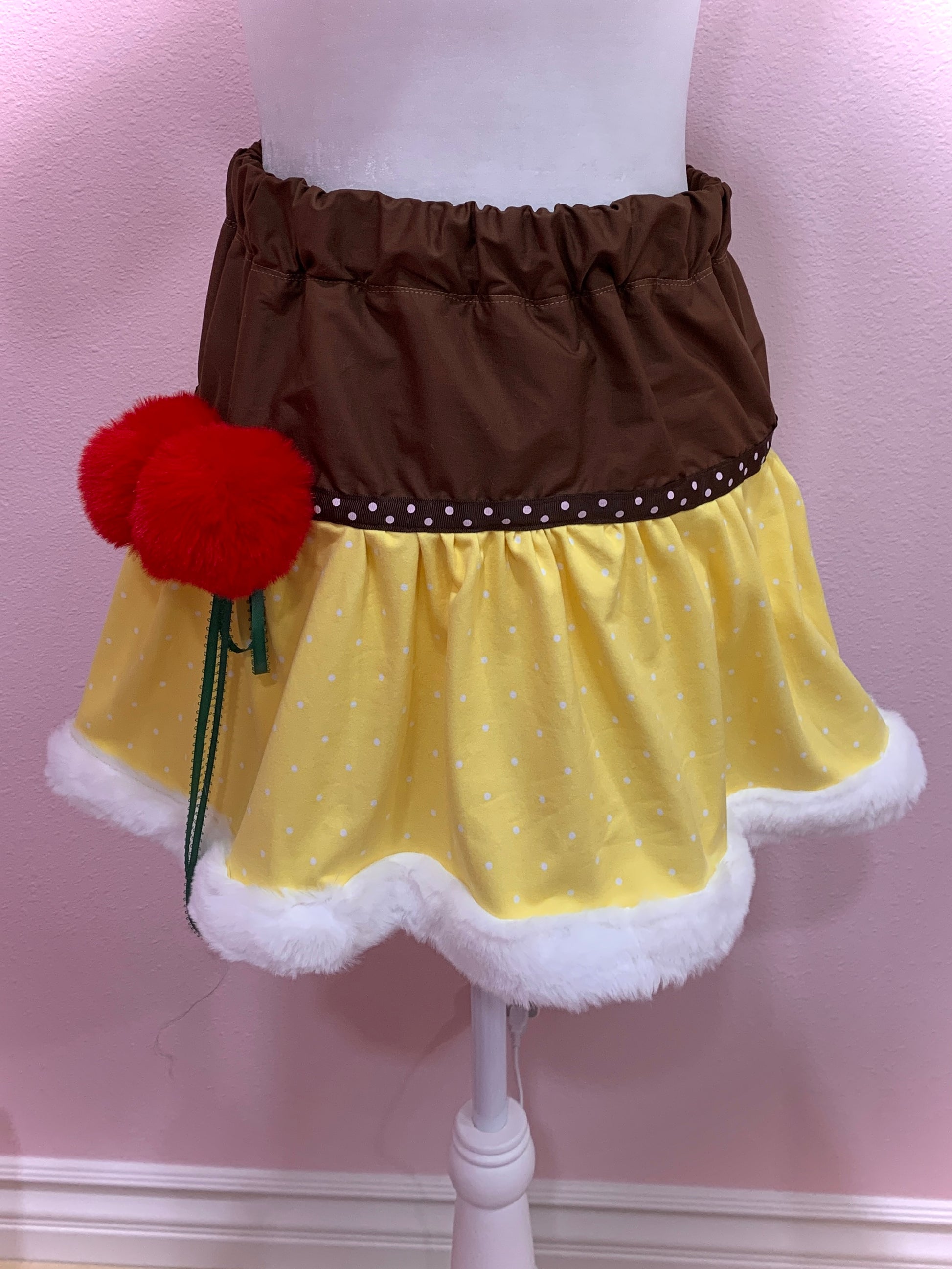 This is a simpler version of the tiered pudding skirt, with some differences! It has faux fur trim at the bottom <3 Includes detachable puff ball brooch. Roughly size US Small.