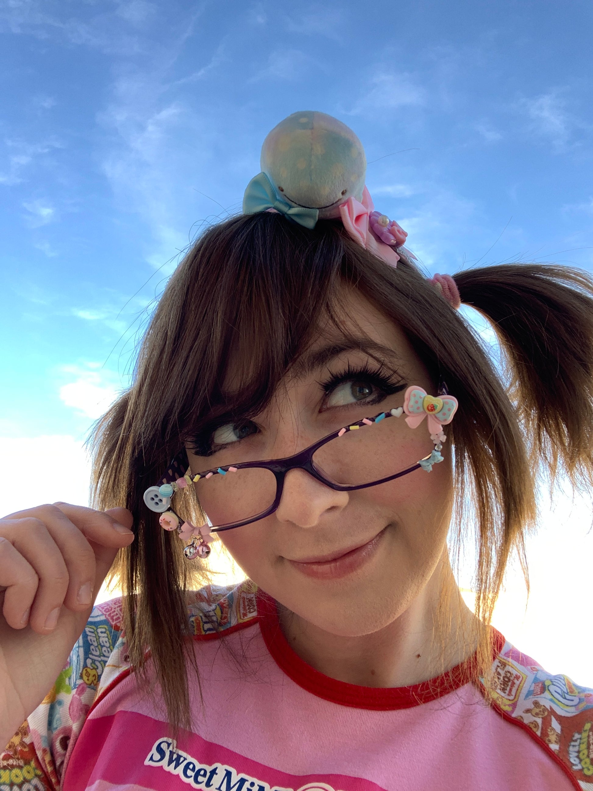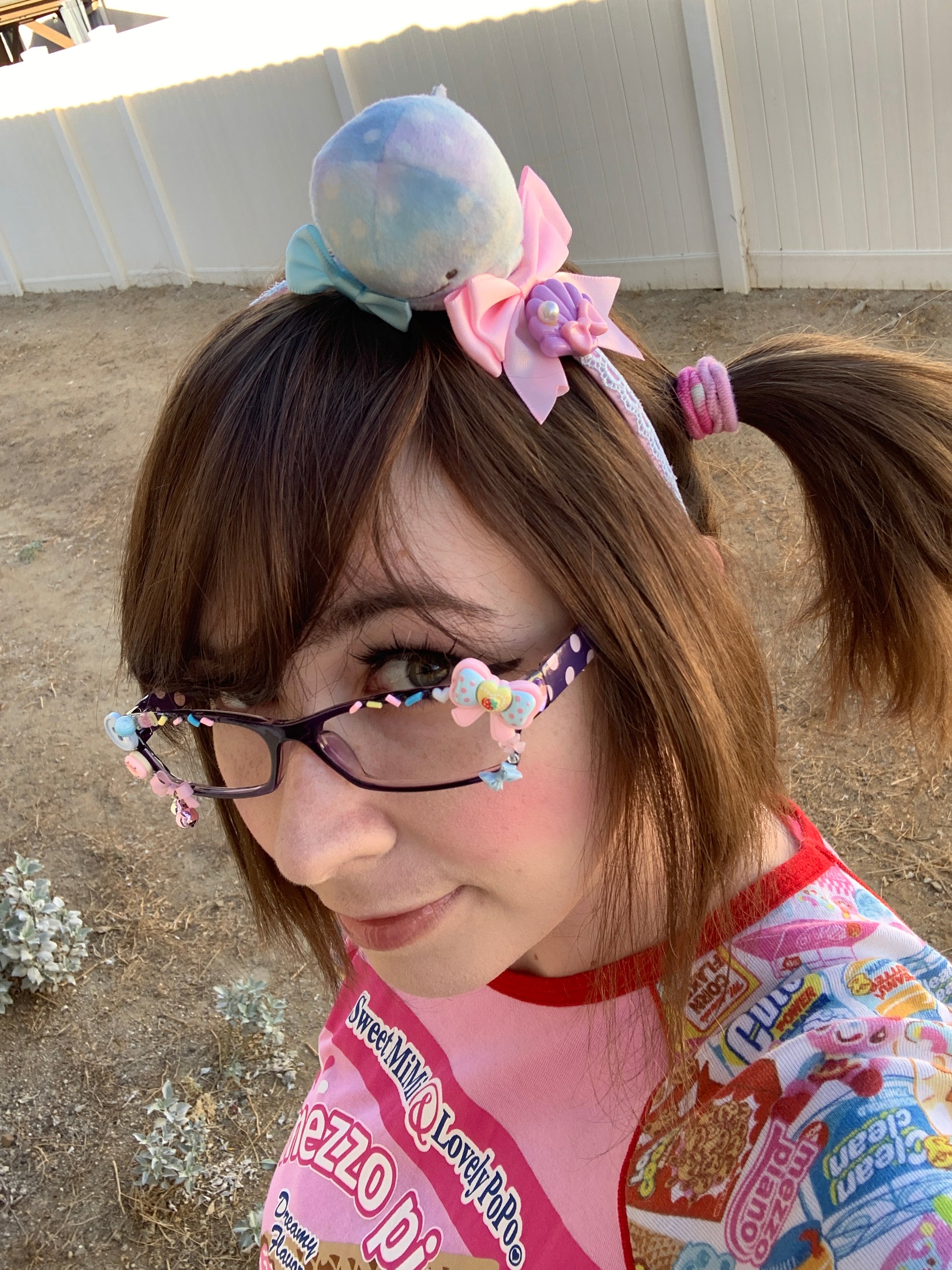 Happy Jinbesan plush on a headband! Features lace and bows and a purple shell<3