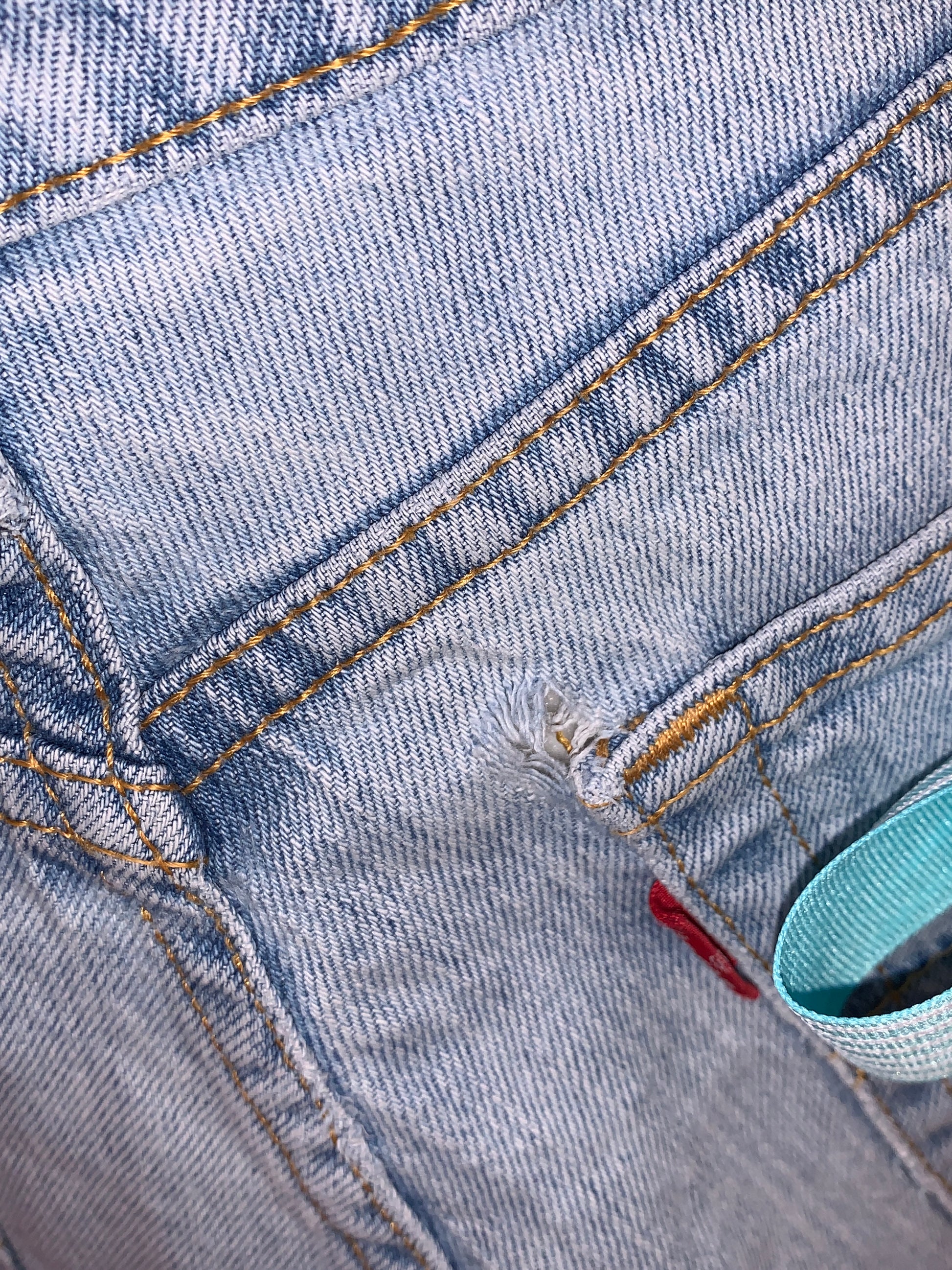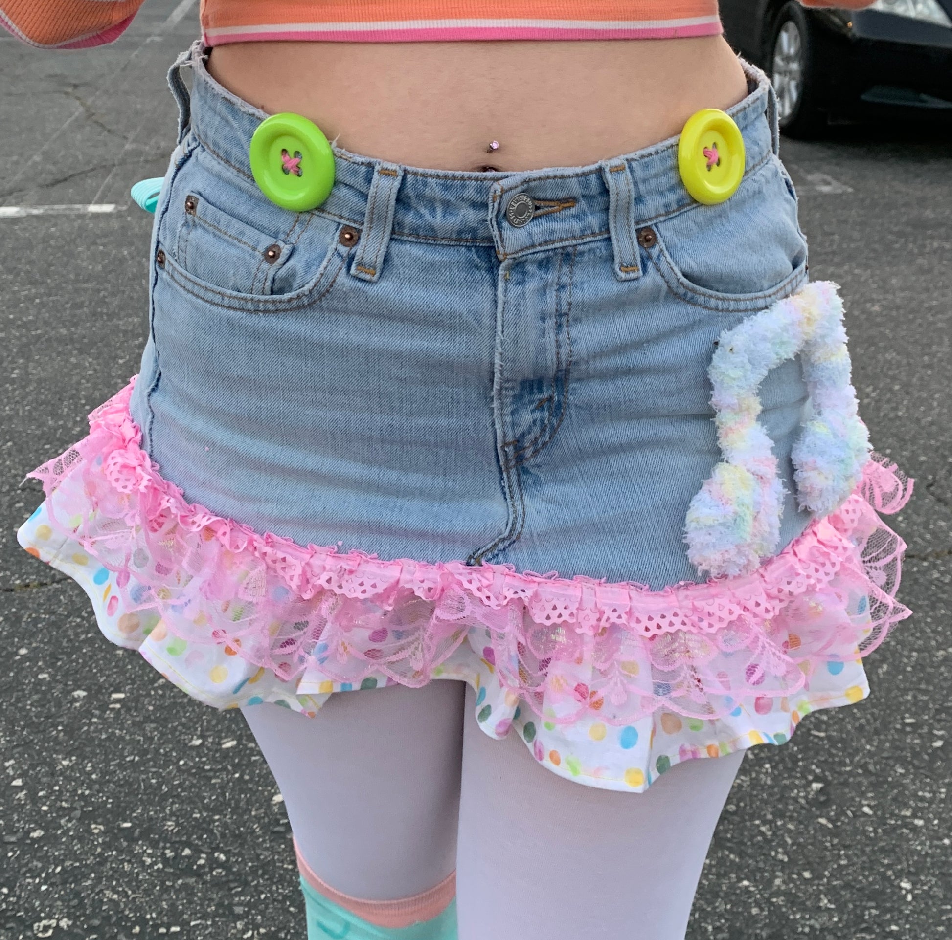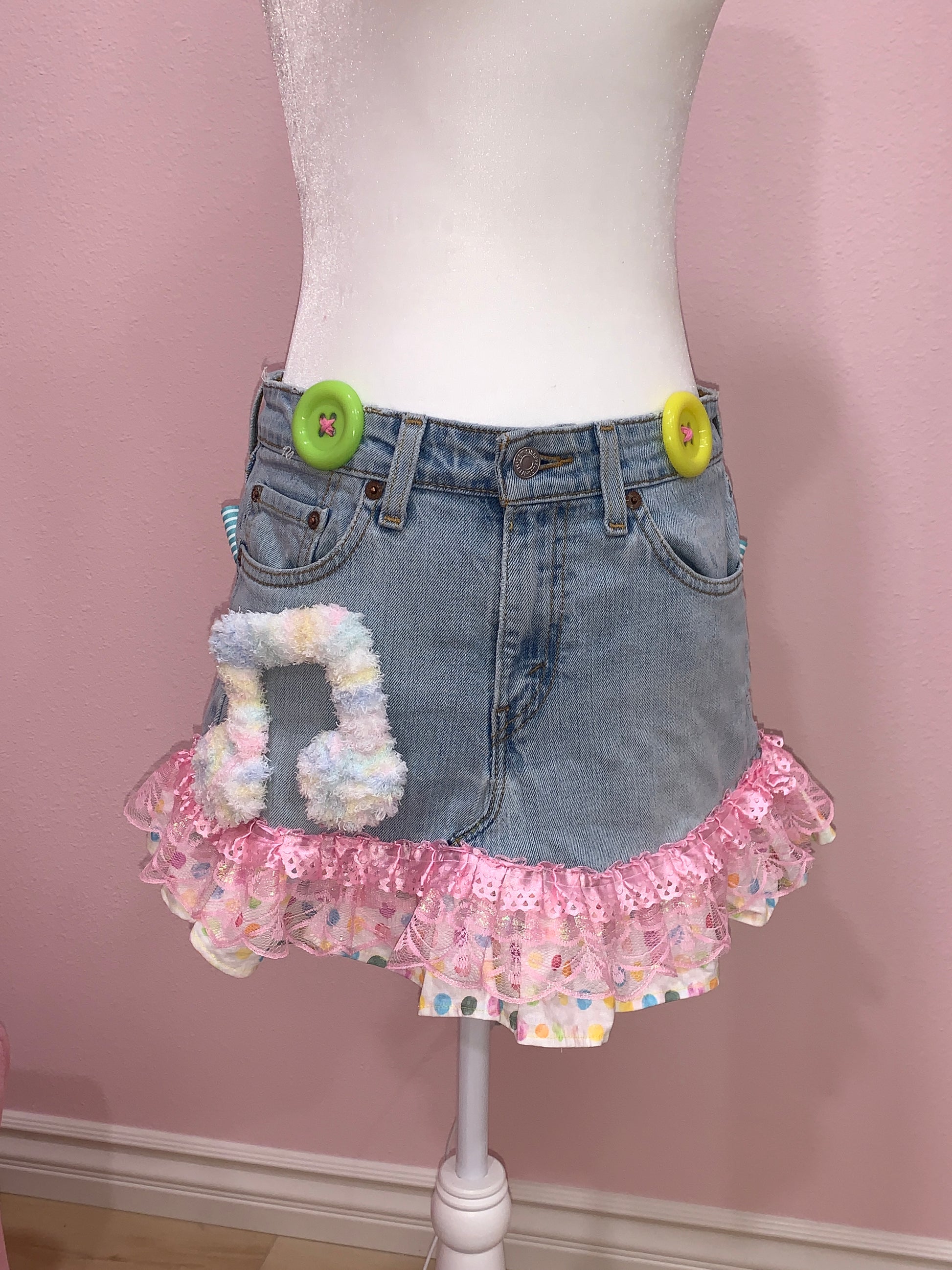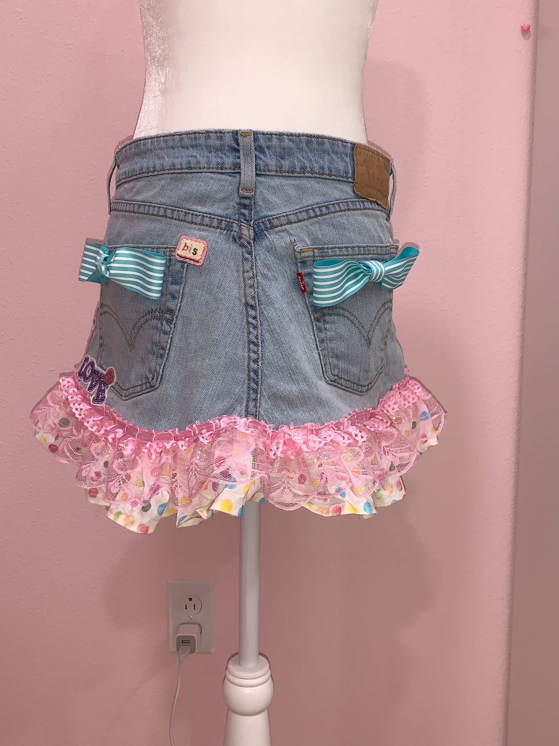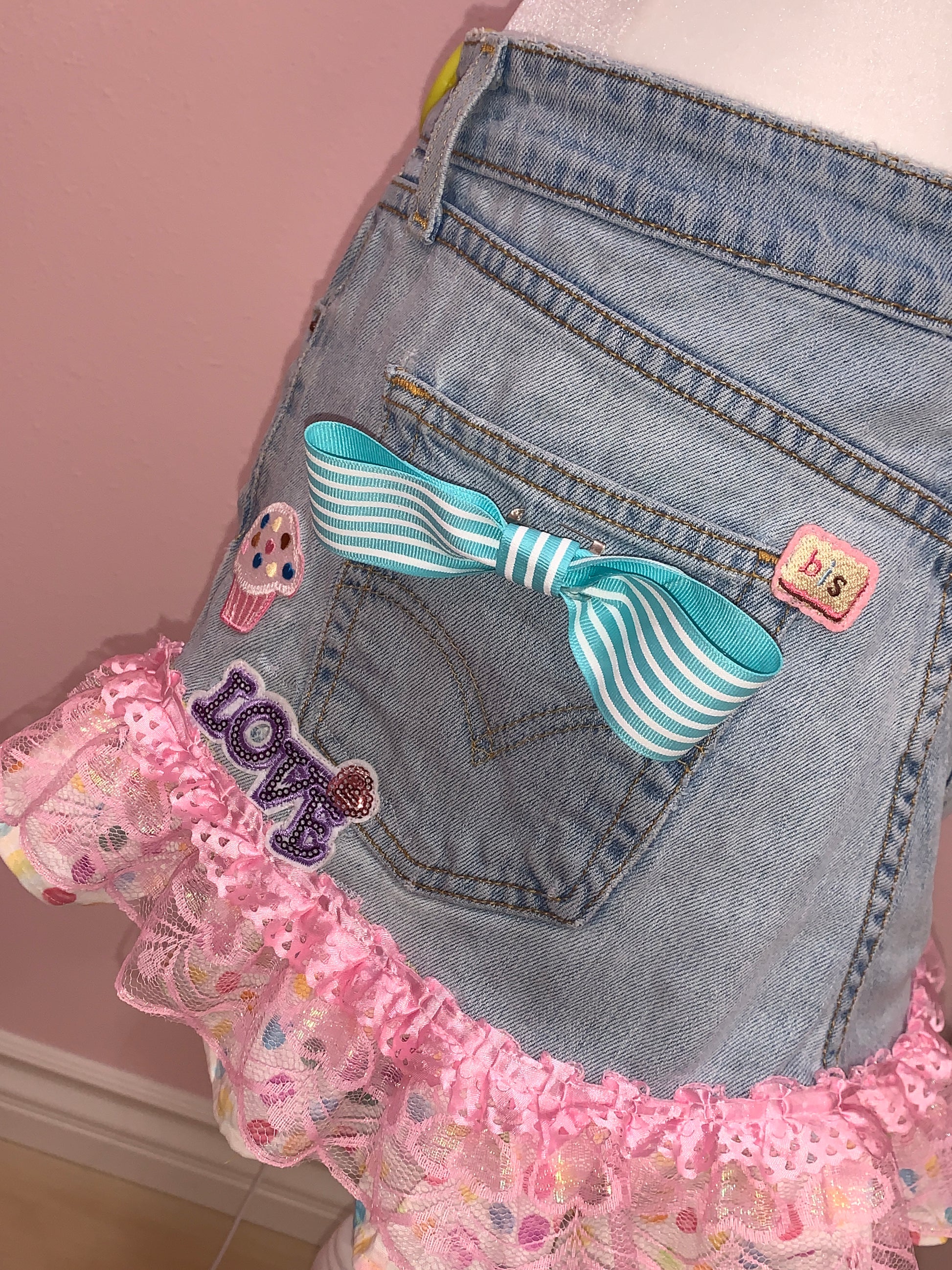 Made from upcycled Levi’s shorts! The store I bought them from had them listed as a size 30, the tag says size 7/L. There is a small hole by the back pocket. The fuzzy music note is detachable, along with the blue bows on the back pockets. The buttons and patches are not detachable. Please remove all detachable items before washing! 💗^w^