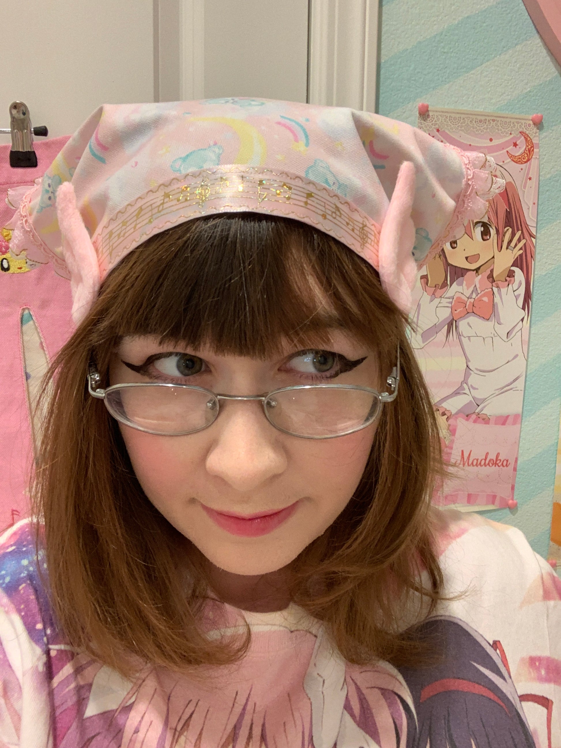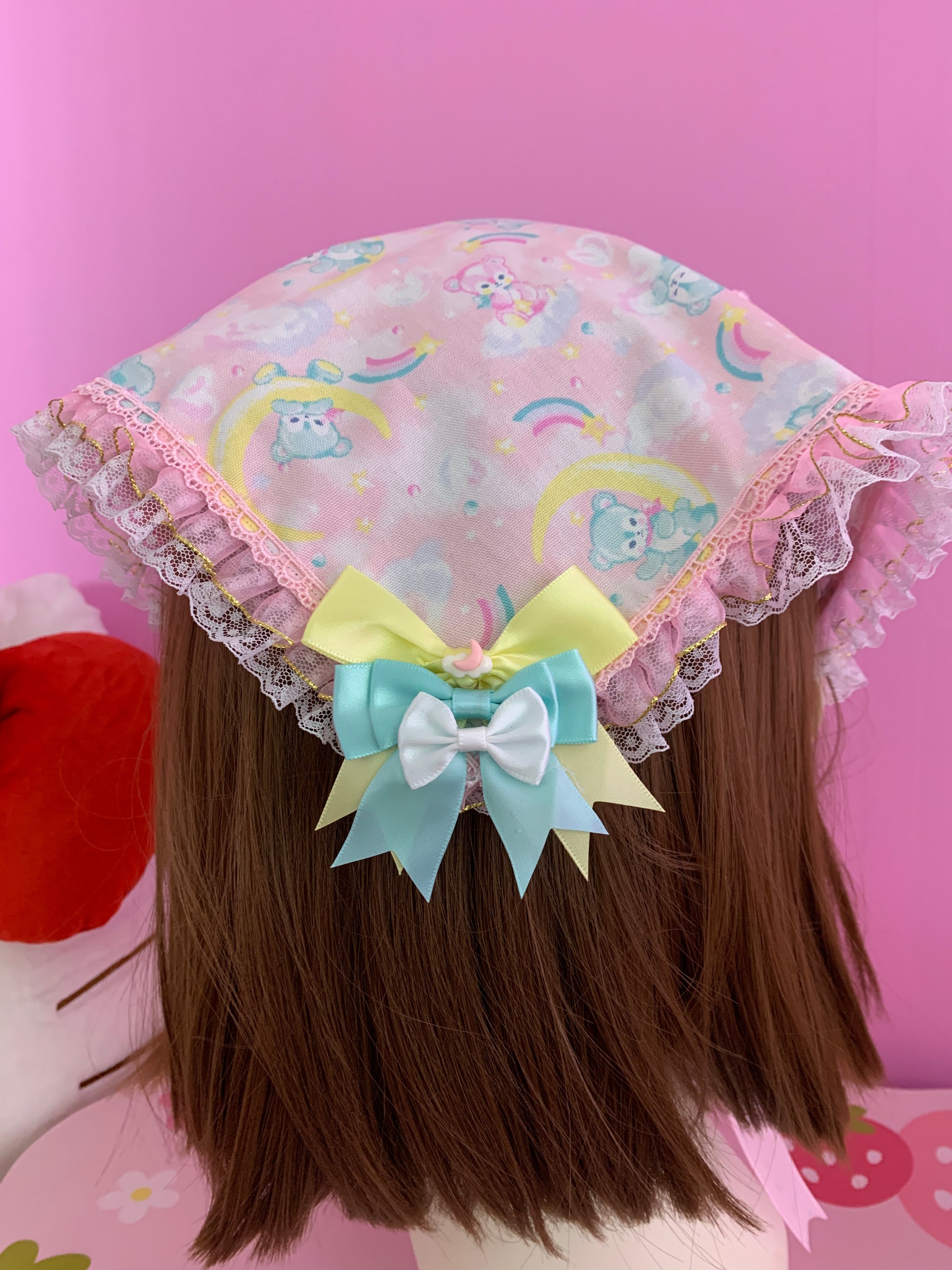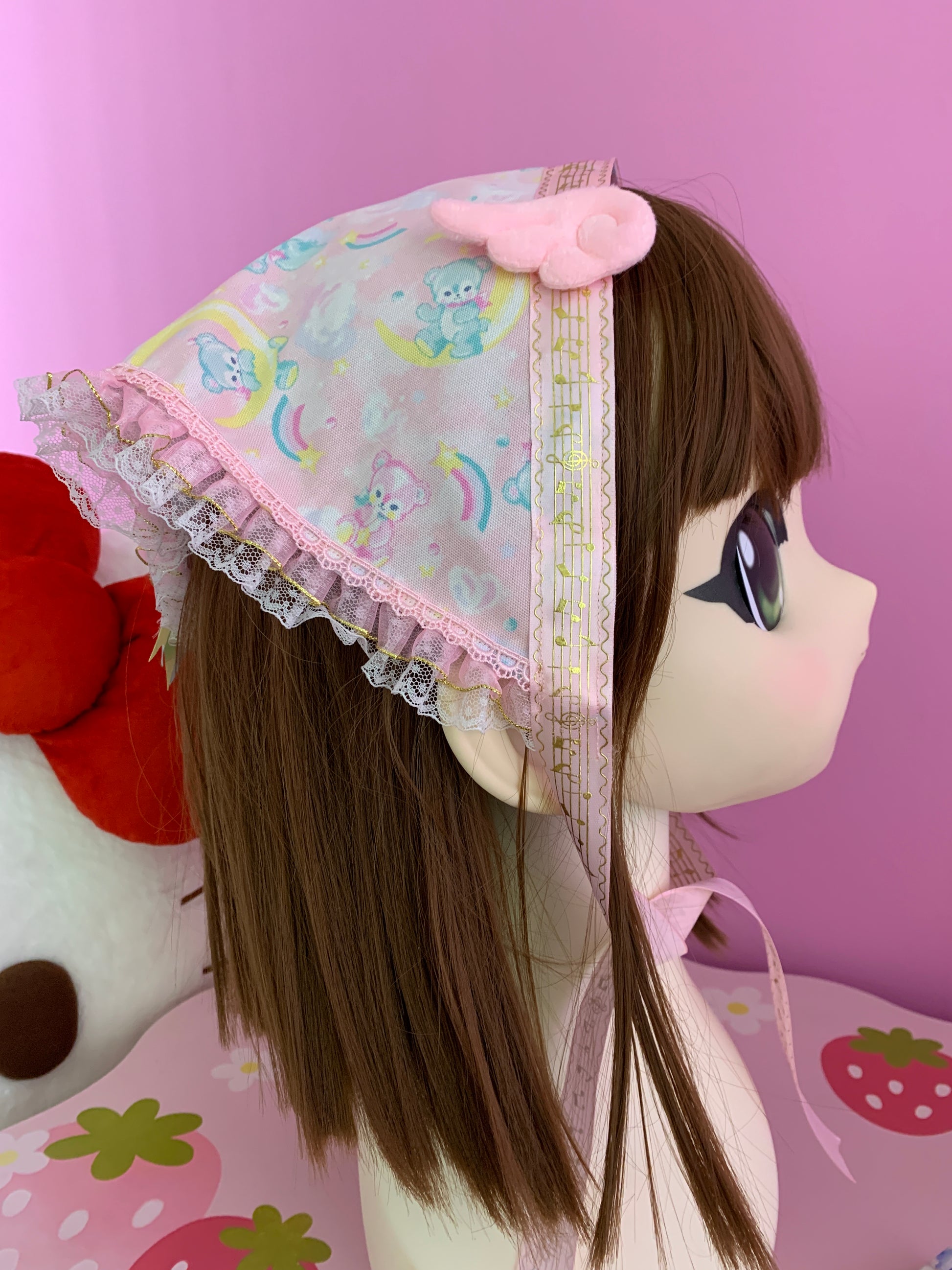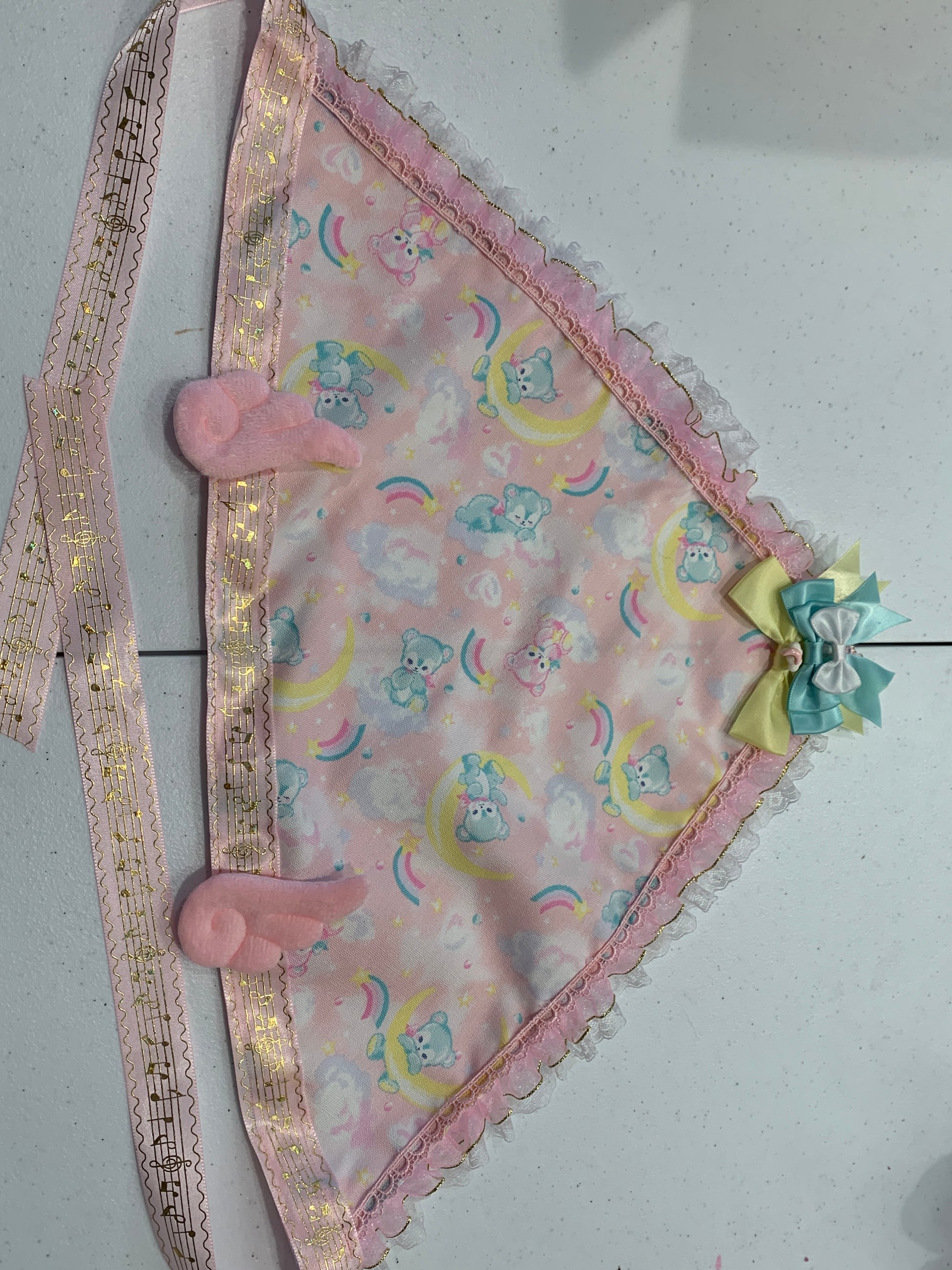 A very yume kawaii style bandana featuring cute pink angel wings and gold music note ribbon, as well as ruffle trim with gold details, and three colorful stacked bows on the back! Elegant and cute at the same time >.<