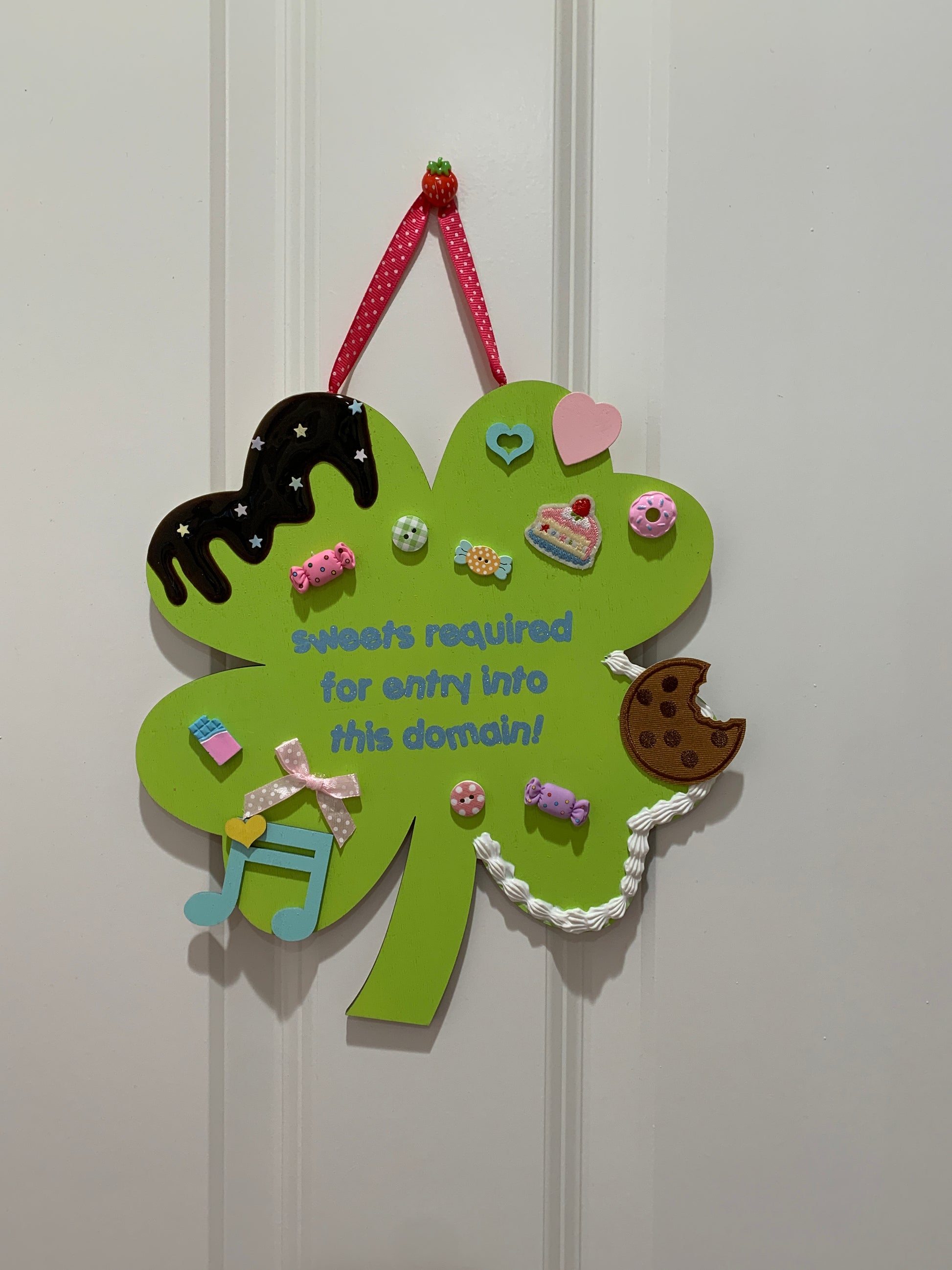 A wooden room sign that reads, "sweets required for entry into this domain!"